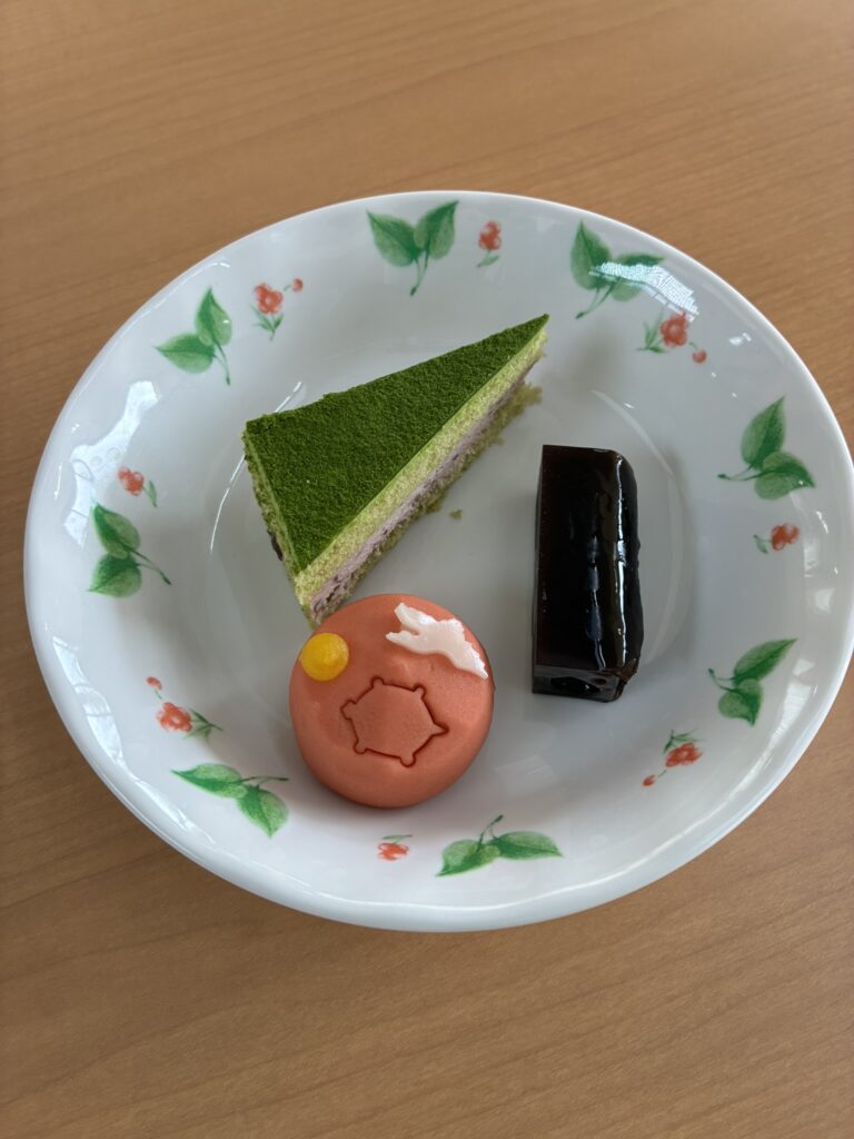 抹茶ケーキ、鶴亀和菓子、塩ようかんの3種類ご用意しました!